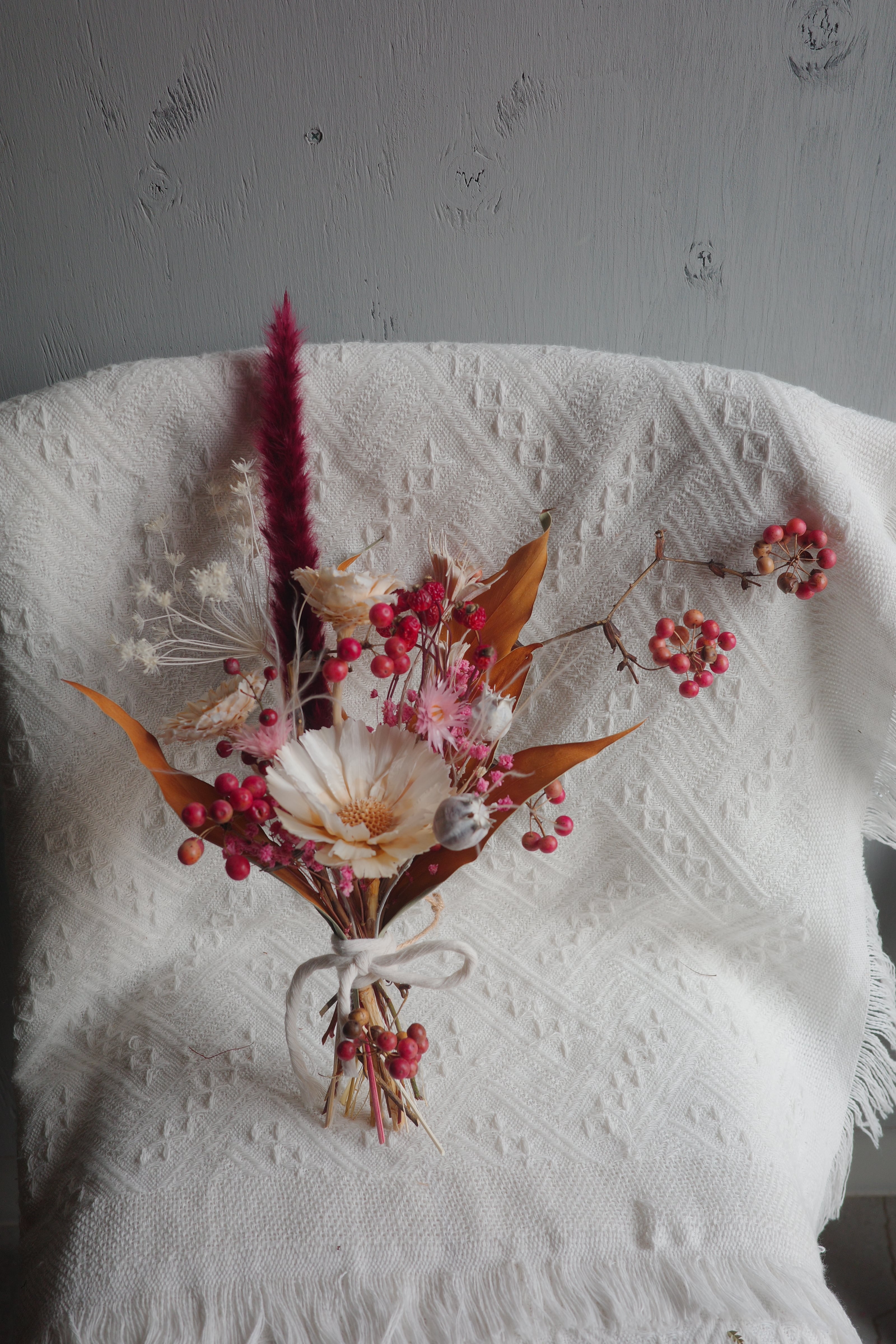 赤やピンクの着色素材を使った華やかで可愛いスワッグ。