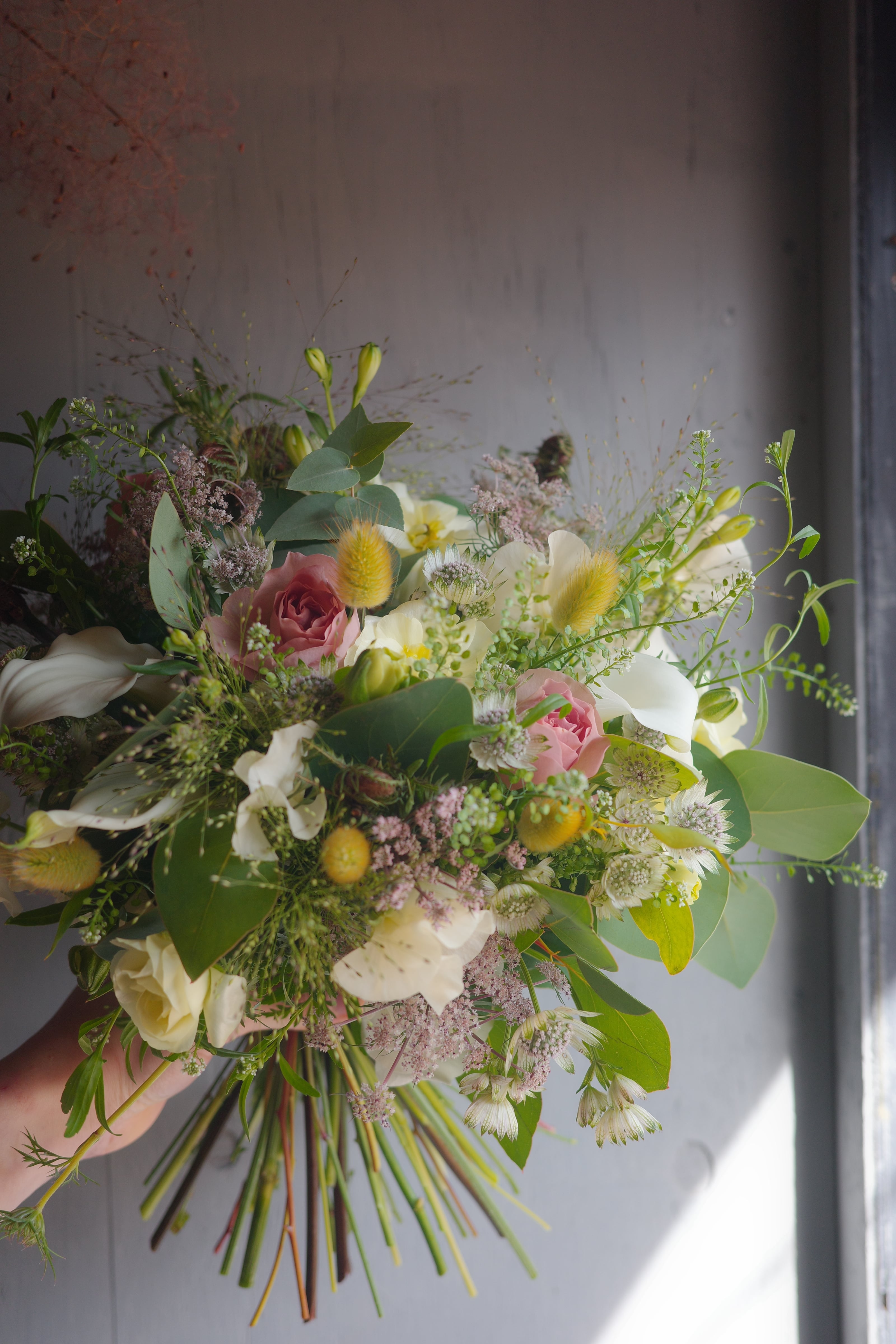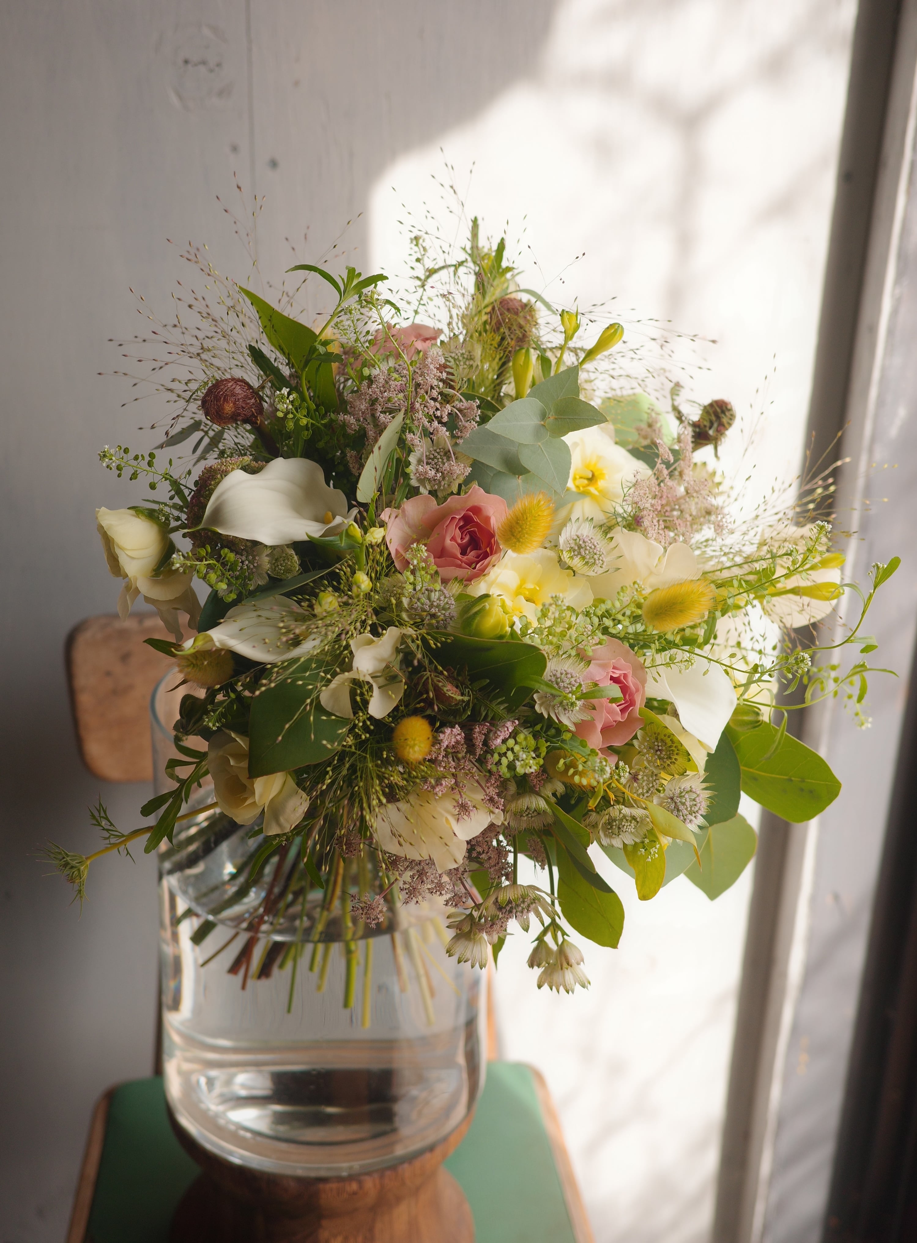 小花、草花。可憐な素材をたっぷり使用して束ねます。