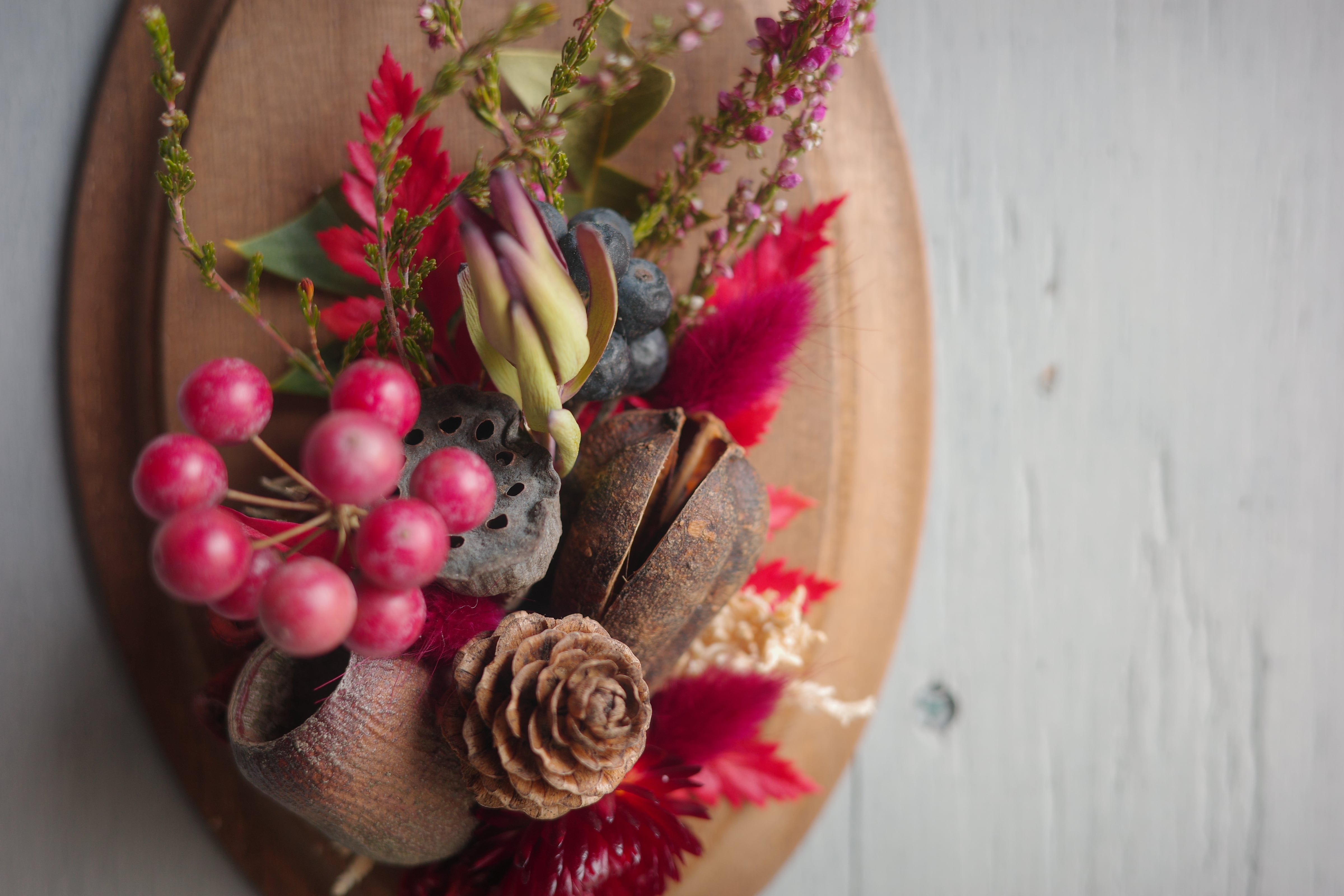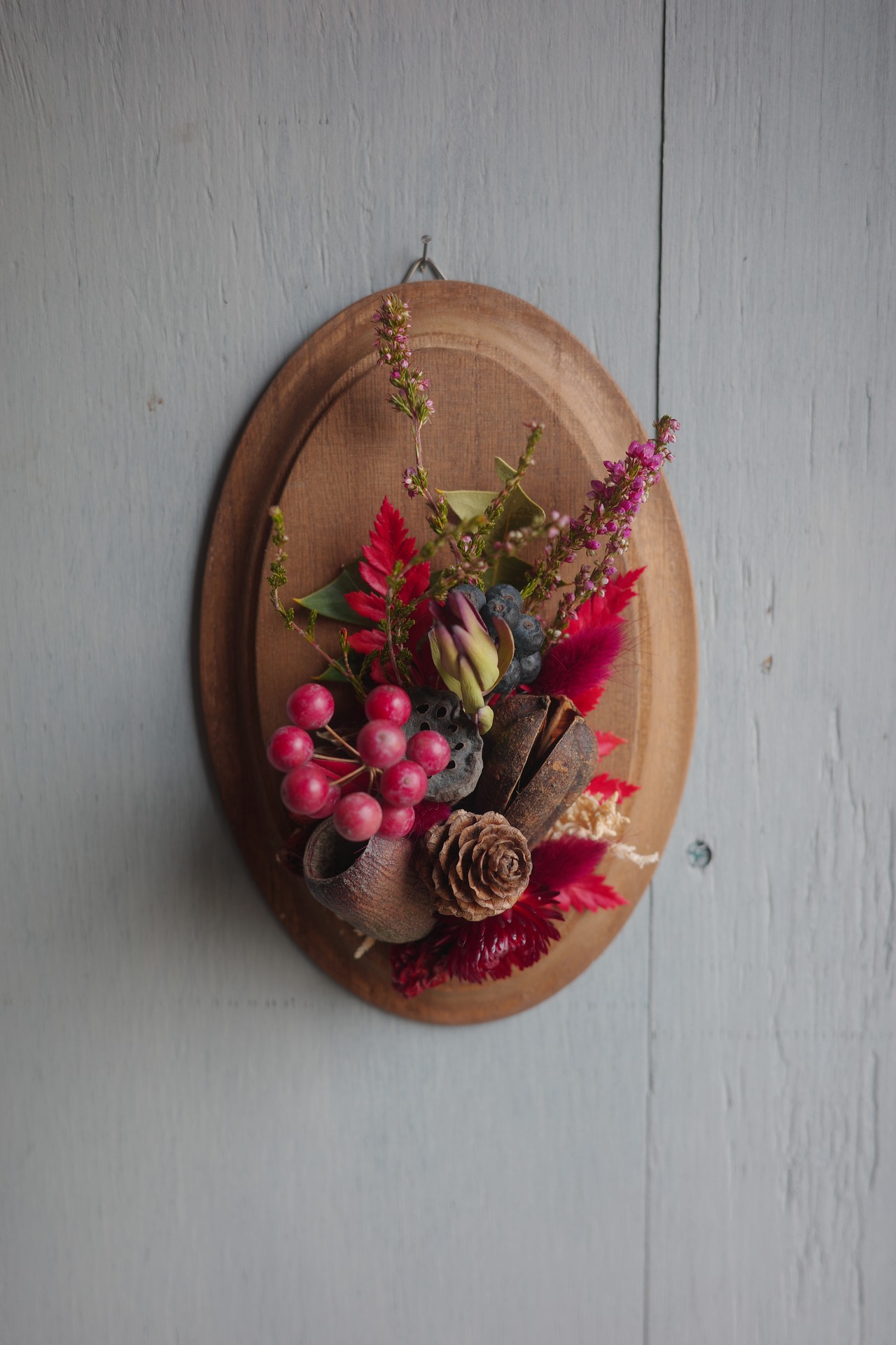 桐の楕円板の上に、自然な素材をアレンジした素朴な壁飾り。